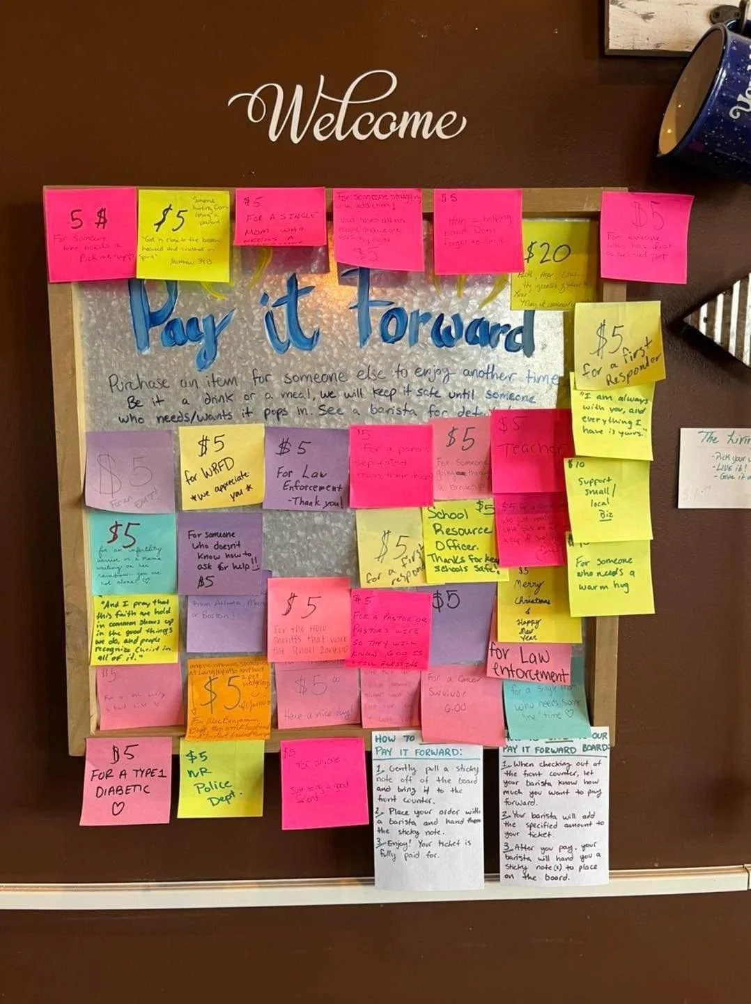 One of the simplest and most joyful ways we serve is through our Pay‑It‑Forward Board. It’s filled with prepaid vouchers that anyone can use on drinks, baked goods, and other treats. That means a neighbor can walk in, pick a voucher, and enjoy a moment of kindness. It’s generosity in motion: community supporting community.