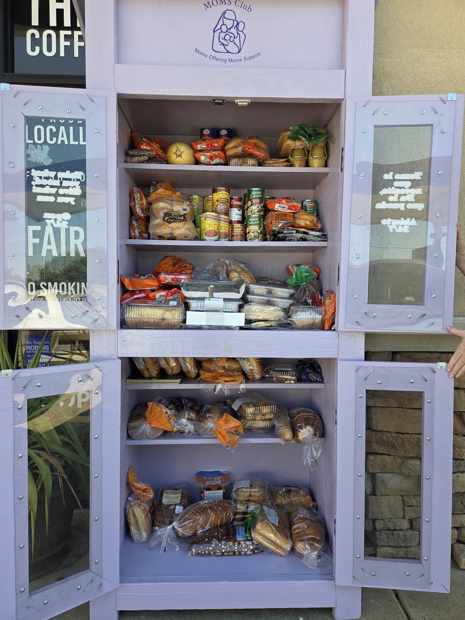 The MOMS Club® 24/7 Community Pantry is located in front of our store. It’s outside, so you can visit it any time of the day or night. Stock updates are posted weekly on their Facebook Page: MOMS Club of Warner Robins Community Pantries. The pantry cannot safely store any cold-held, dairy, or perishable items. Non-food items such as clothes, crafts, toys, and *plain scented* deodorant/soap are also encouraged. Please do not place cash in the pantry.
