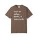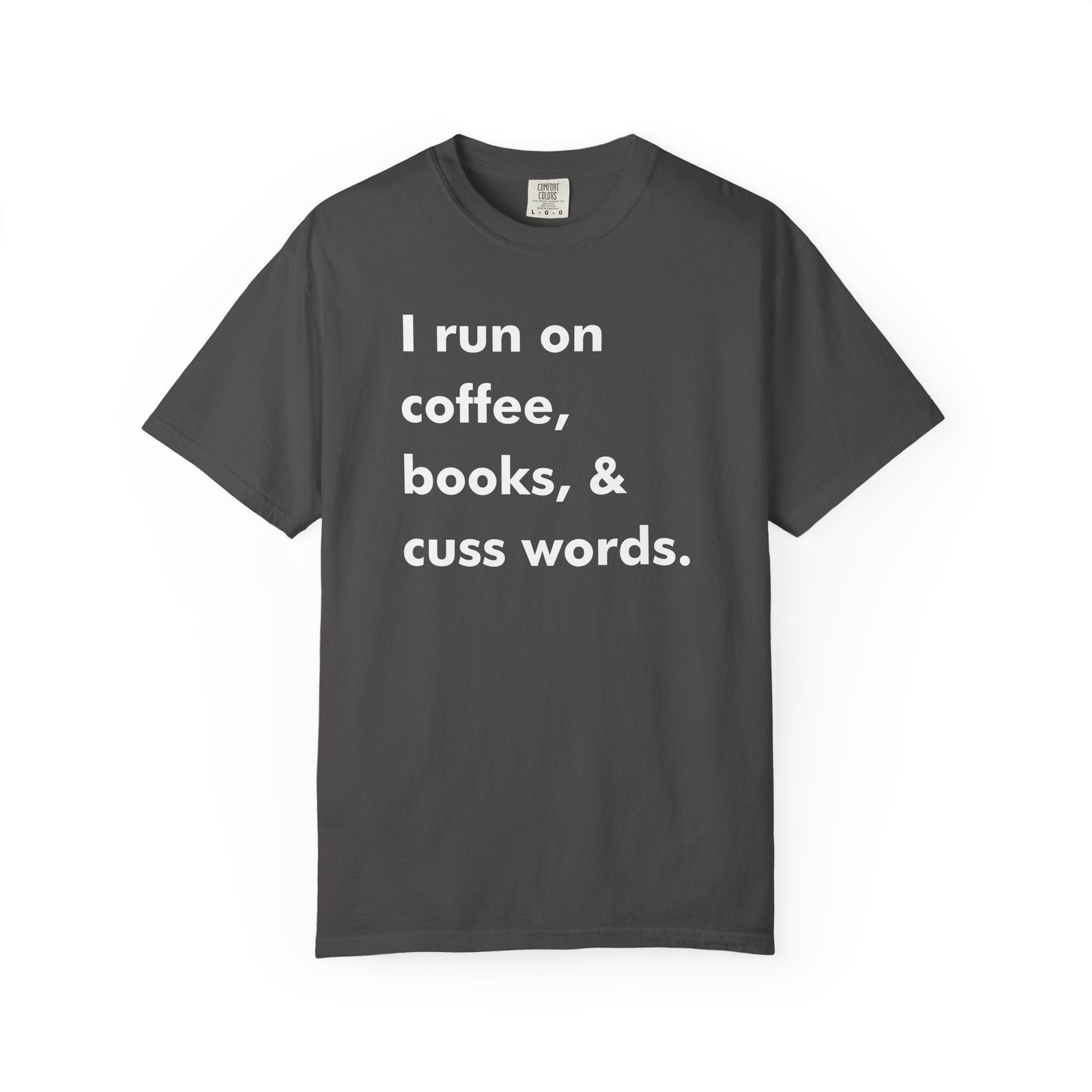 Soft, lived-in cotton. This garment-dyed tee feels broken-in from day one — the color is gentle, the fabric has weight, and the relaxed cut lets you curl up with a novel or step out for a coffee run without fuss. Front text reads: “I run on coffee, books, & cuss words.” The back shows a latte-heart icon with the phrase “Between Friends Coffee.” Wear it with leggings and a cardigan for reading nooks, or layer it under a favorite jacket for neighborhood cafe hangs. It’s the kind of shirt that fits into slow mornings, dog-eared pages, and the small, loud moments with friends.